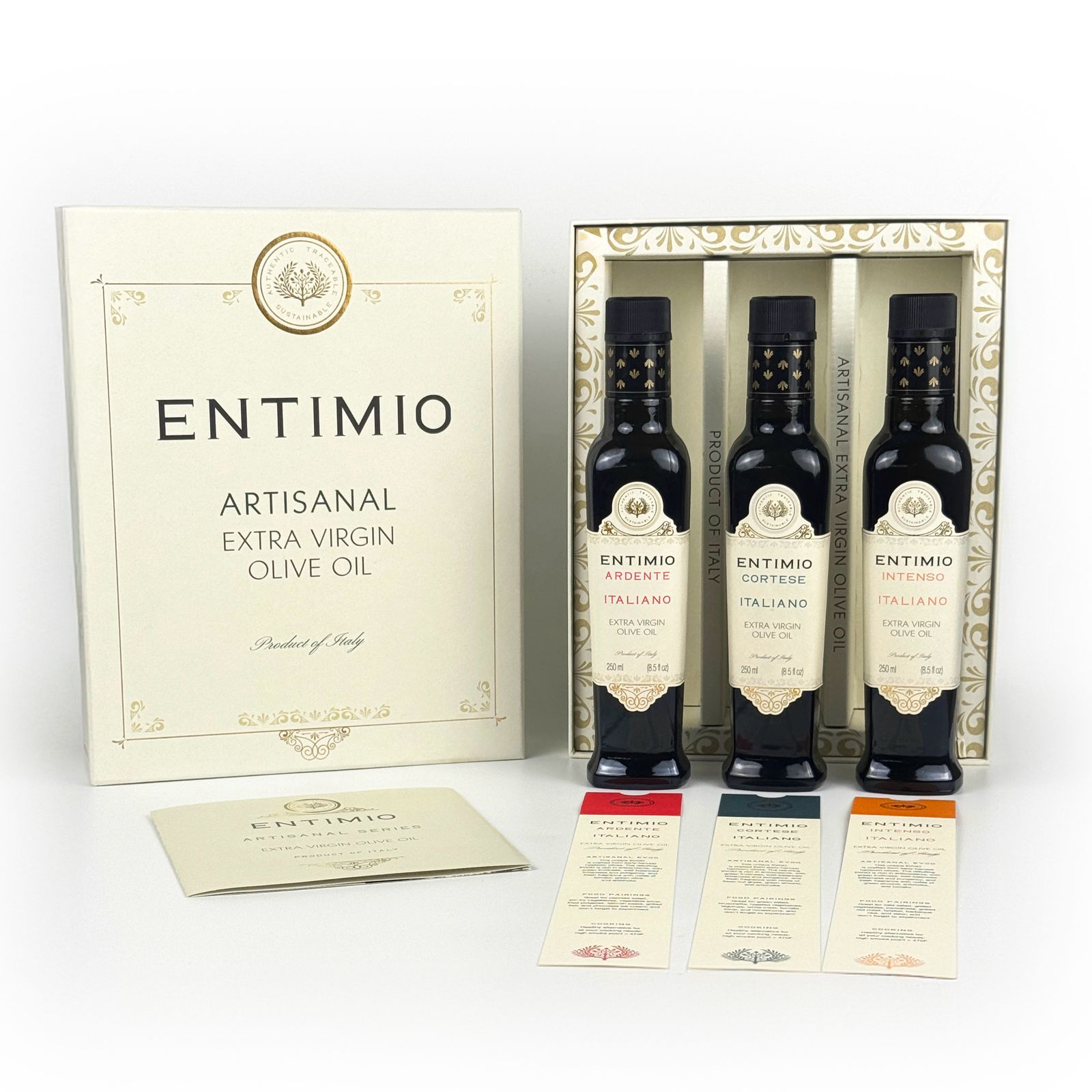 Entimio Collection Gift-Box | 2024-25 Harvest Organic Extra Virgin Olive Oil Set, Early Harvest from Italy | 25.5 (3 x 8.5) fl oz